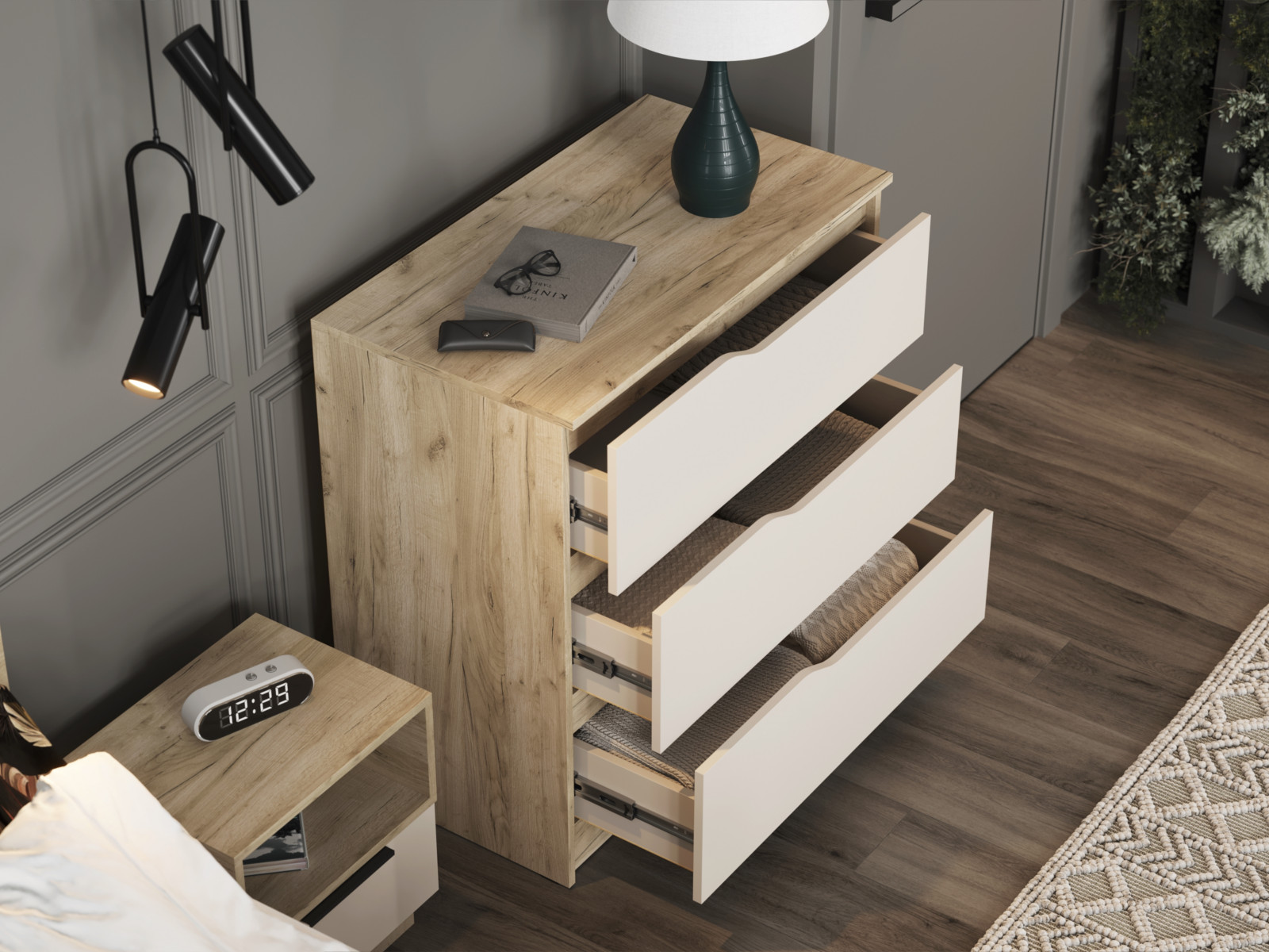 Обеспечивают достаточно места для хранения различных вещей. Ящики оснащены шариковыми направляющими полного выдвижения длиной 400 мм, что гарантирует плавное и бесшумное открытие и закрытие.