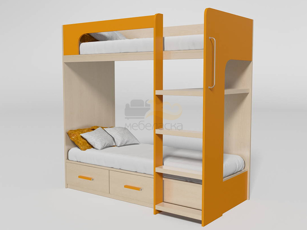 Подростковая кровать разработана с учетом требований эргономики и современного европейского дизайна. Кровать имеет два полноценных спальных места. Ступени лесенки изготовлены из усиленной ЛДСП 32 мм. Внизу расположены два вместительных короба для белья и игрушек, которые бесшумно скользят благодаря усиленным направляющим полного выдвижения.