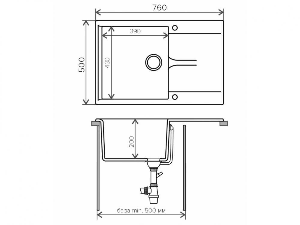 Минимальный размер тумбы под мойку, мм: 500