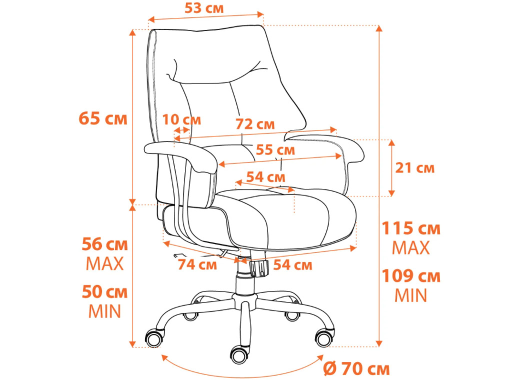 - Широкие мягкие подлокотники, механизм регулировки высоты сиденья и угла наклона до 15 градусов с возможностью фиксации в трех положениях
