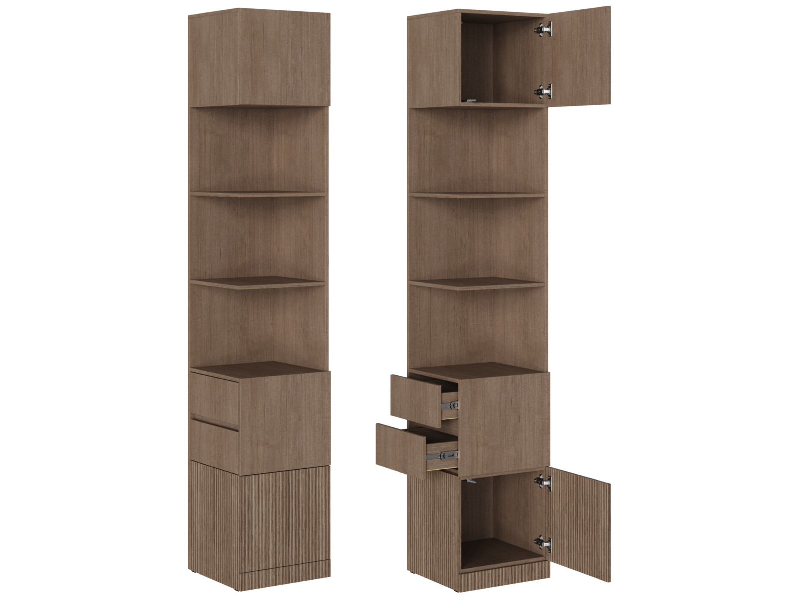Четвертая часть расположена внизу стеллажа. Габарит отсека Д.418 х В.368 х Г.426 мм. Видимая боковина и створка из ЛДСП в цвет фасада. Фасад открывается при помощи отталкивателя.
