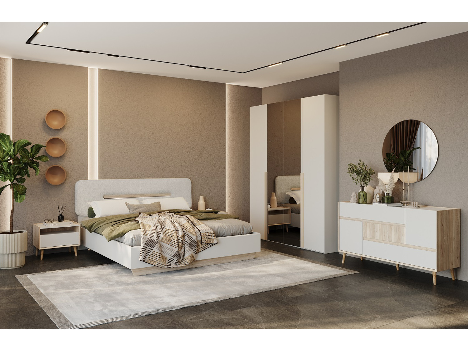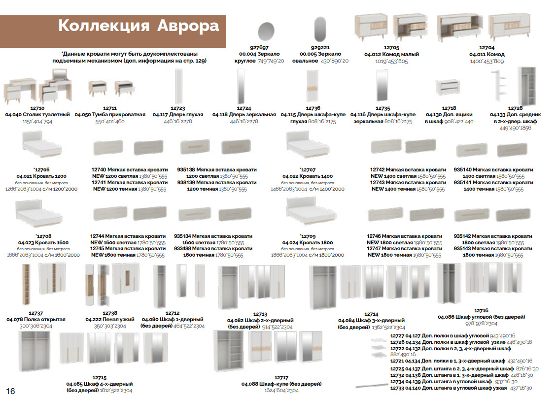 Цена за комплект: Комод , Шкаф 4-дверный, Дверь глухая (2шт), Дверь зеркальная (2шт), Тумба прикроватная (2шт), Кровать 1400, Мягкая вставка кровати (к-т) (1400) (Аврора) (Планка) (Светлая), Ортопедическое основание 1400