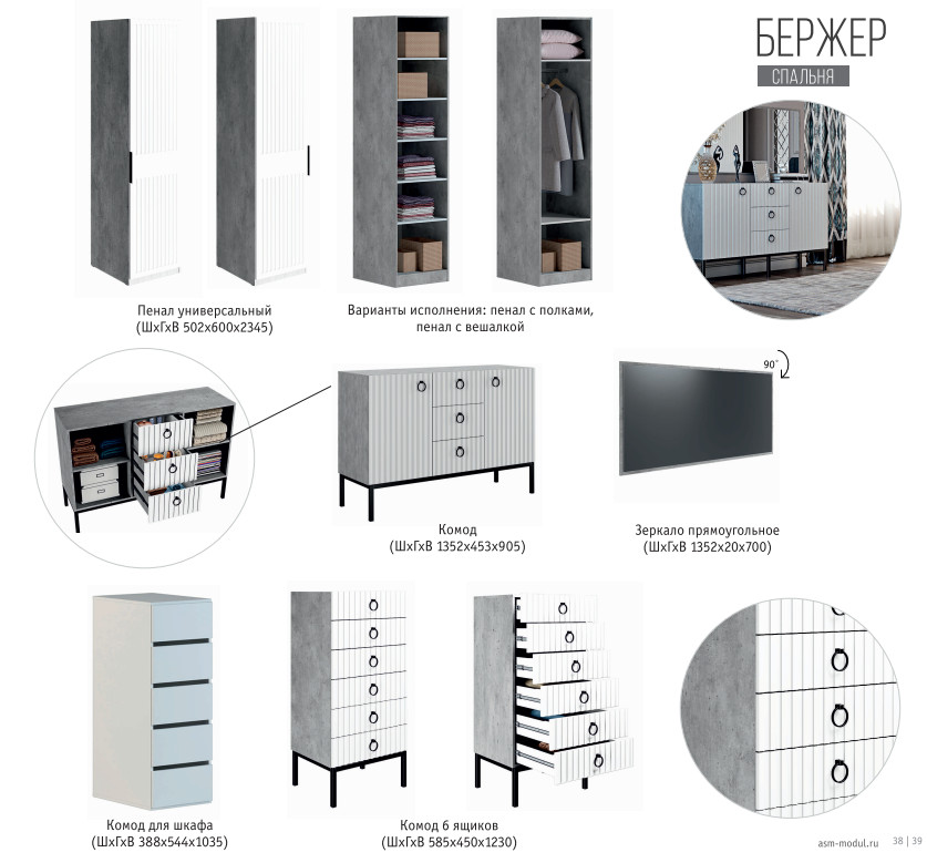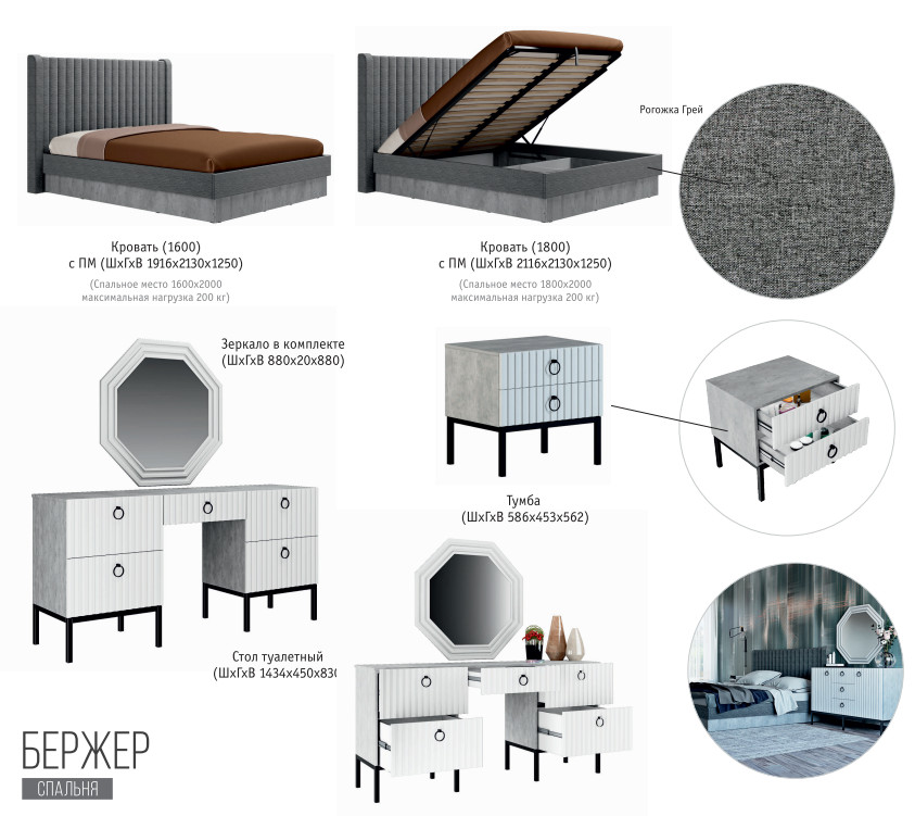 Цена за комплект: Каркас шкафа 4 дв, Двери глухие (2шт), Двери с зеркалом (2 шт), Кровать (1600) с ПМ, Тумба (2шт), Комод, Зеркало