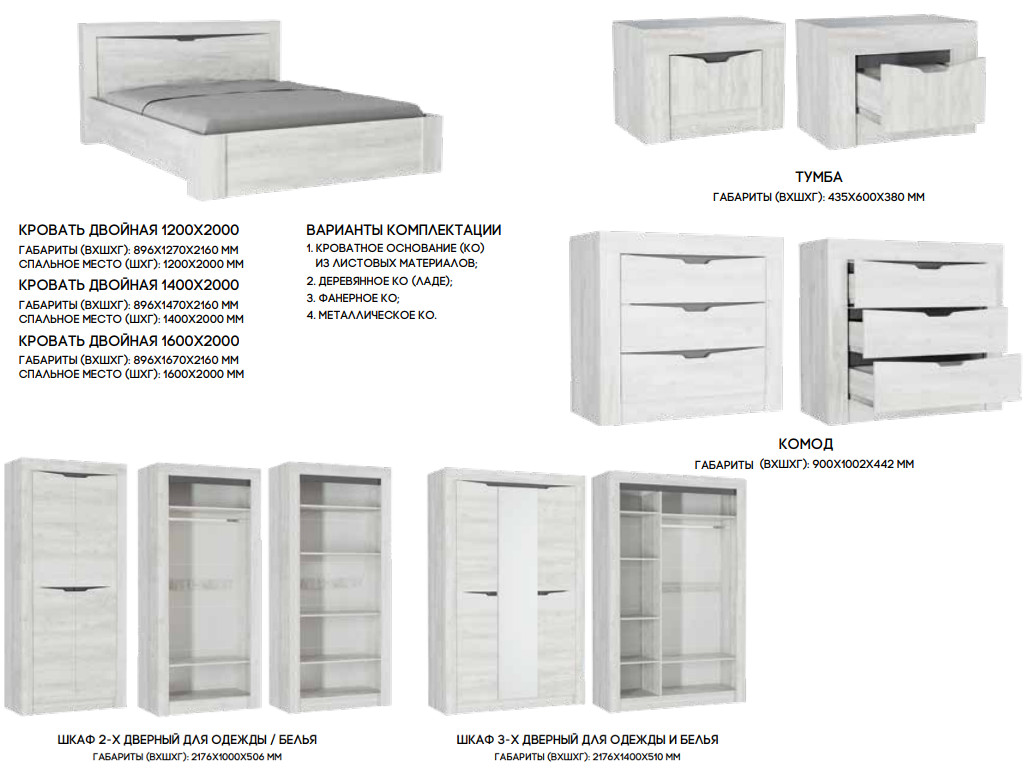 Цена за комплект: Комод, Кровать двойная 1200, Деревянное кроватное основание (1200), Тумба (2шт),Шкаф 3-х дверный