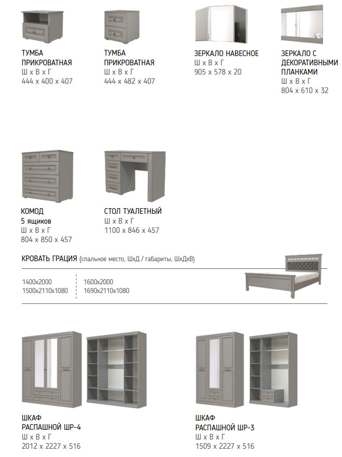 Цена за комплект: зеркало навесное с декоративными планками, стол туалетный, тумба прикроватная 1 ящик, комод 5 ящиков, шкаф для одежды ШР-4, кровать двойная "Грация" 1400, Комплектующие на кровать с ламелями 1400 мм