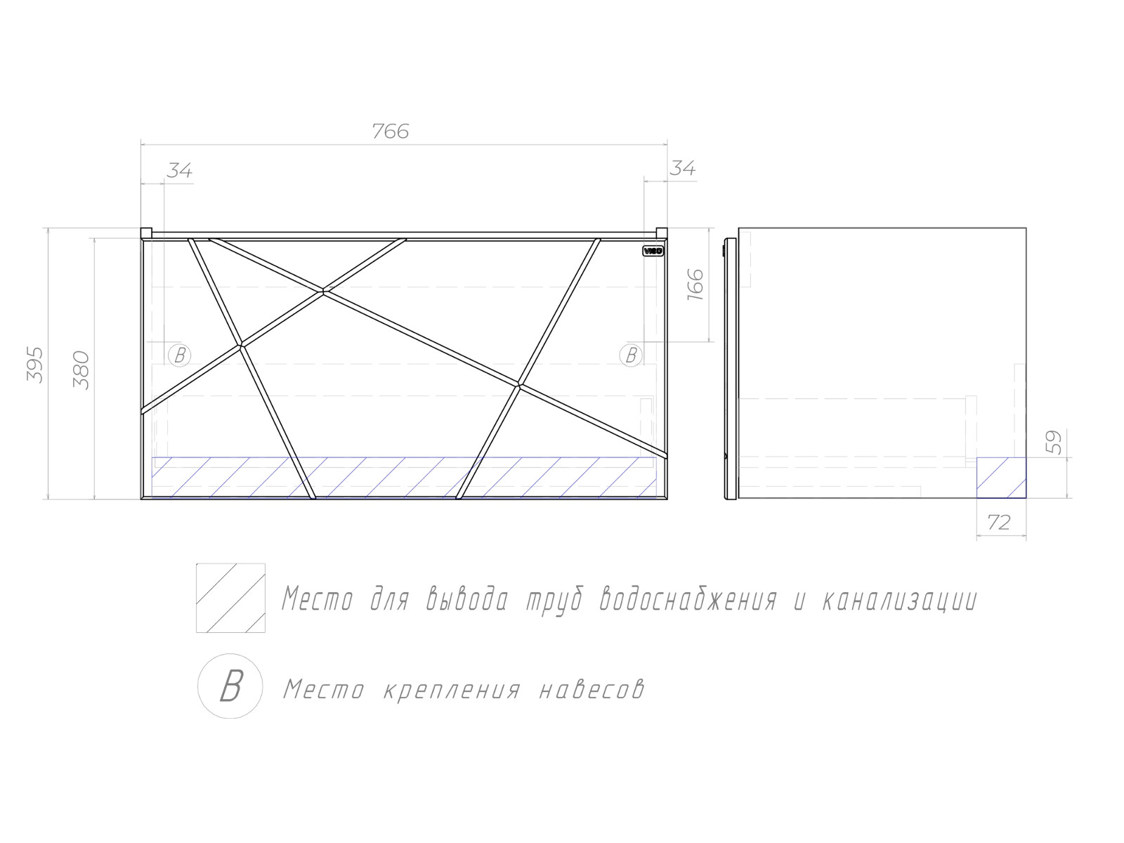 Оснащение: 1 выдвижной ящик, направляющие скрытого монтажа, открывание нажатием "push-to-open", 2 навеса, 1 сифон