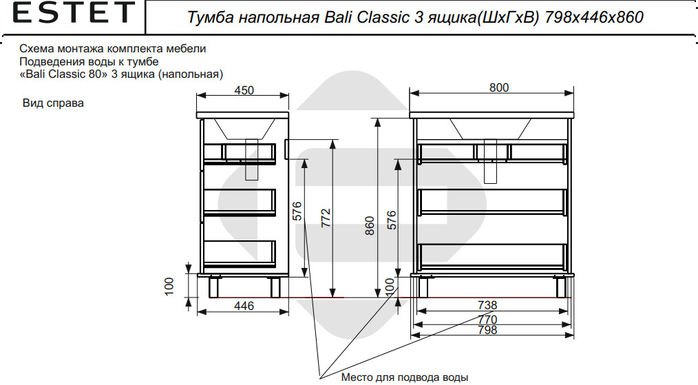 - Тумба с раковиной Bali Classic 800 напольная 3 ящика