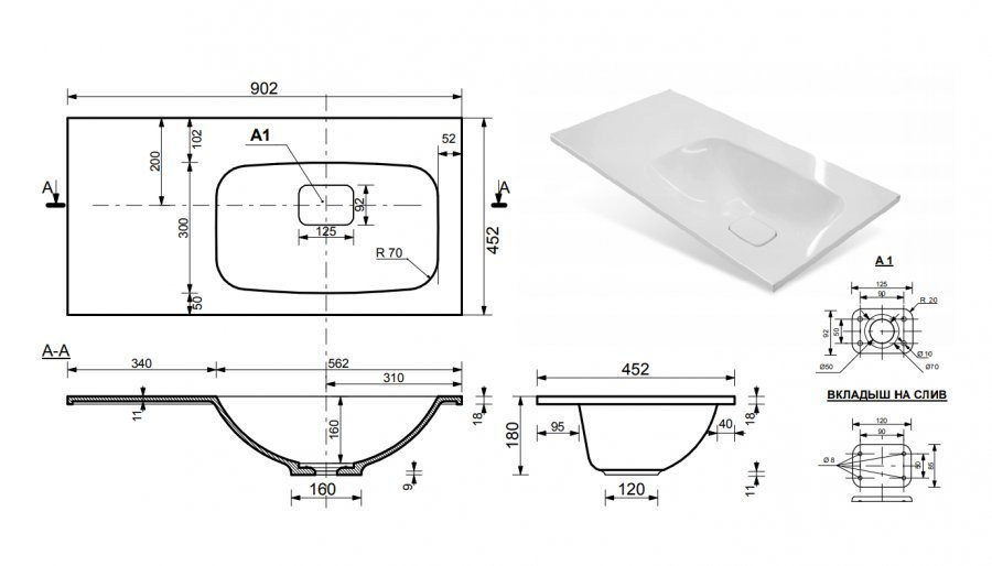 - Раковина из литьевого мрамора с одним отверстием под смеситель и рабочей поверхностью
