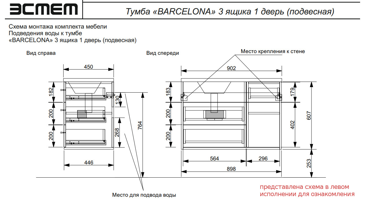 Тумба с раковиной Barcelona 900 правосторонний подвесной 3 ящика 1 дверь
