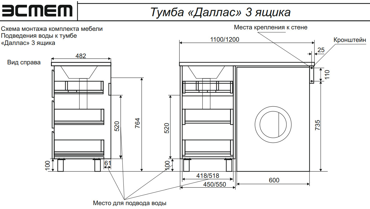 - Тумба с раковиной Dallas Luxe 1100 напольная 3 ящика левая