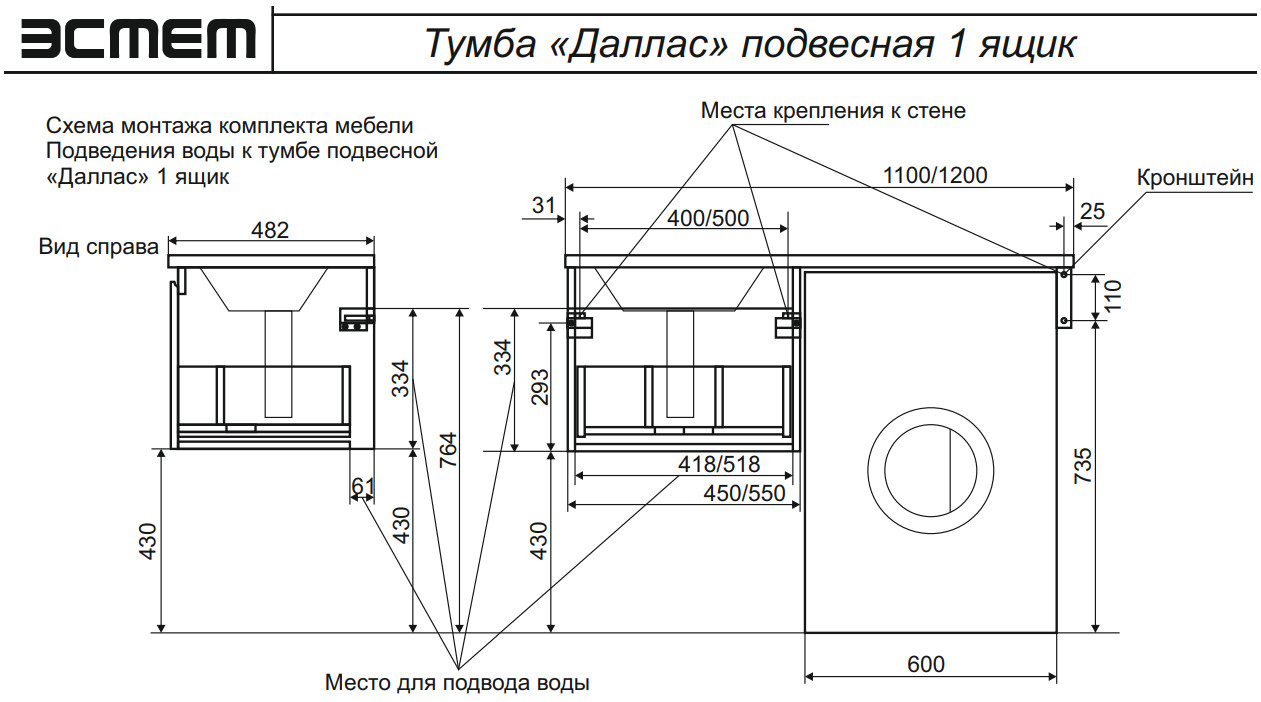 - Тумба с раковиной Dallas Luxe 1100 навесная 1 ящик левая