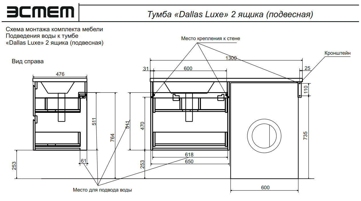 - Тумба с раковиной Dallas Luxe 1300 навесная 2 ящика левая