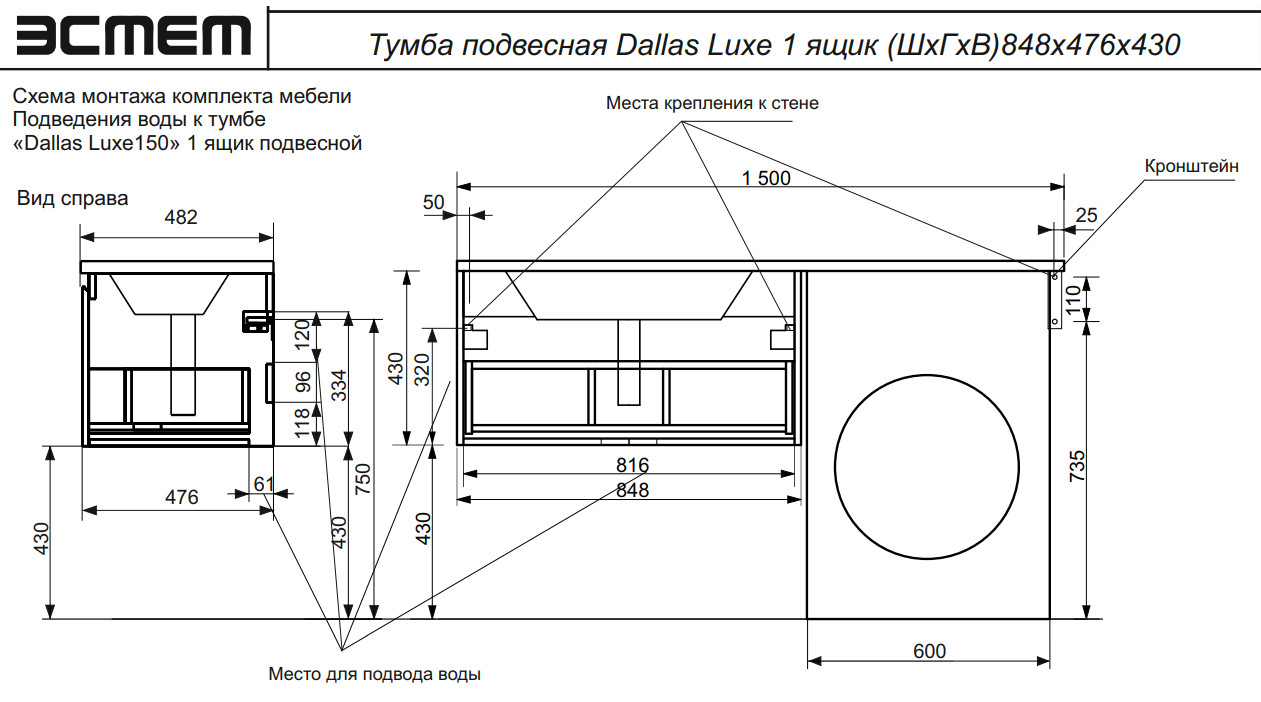 - Тумба с раковиной Dallas Luxe 1500 навесная 1 ящик левая