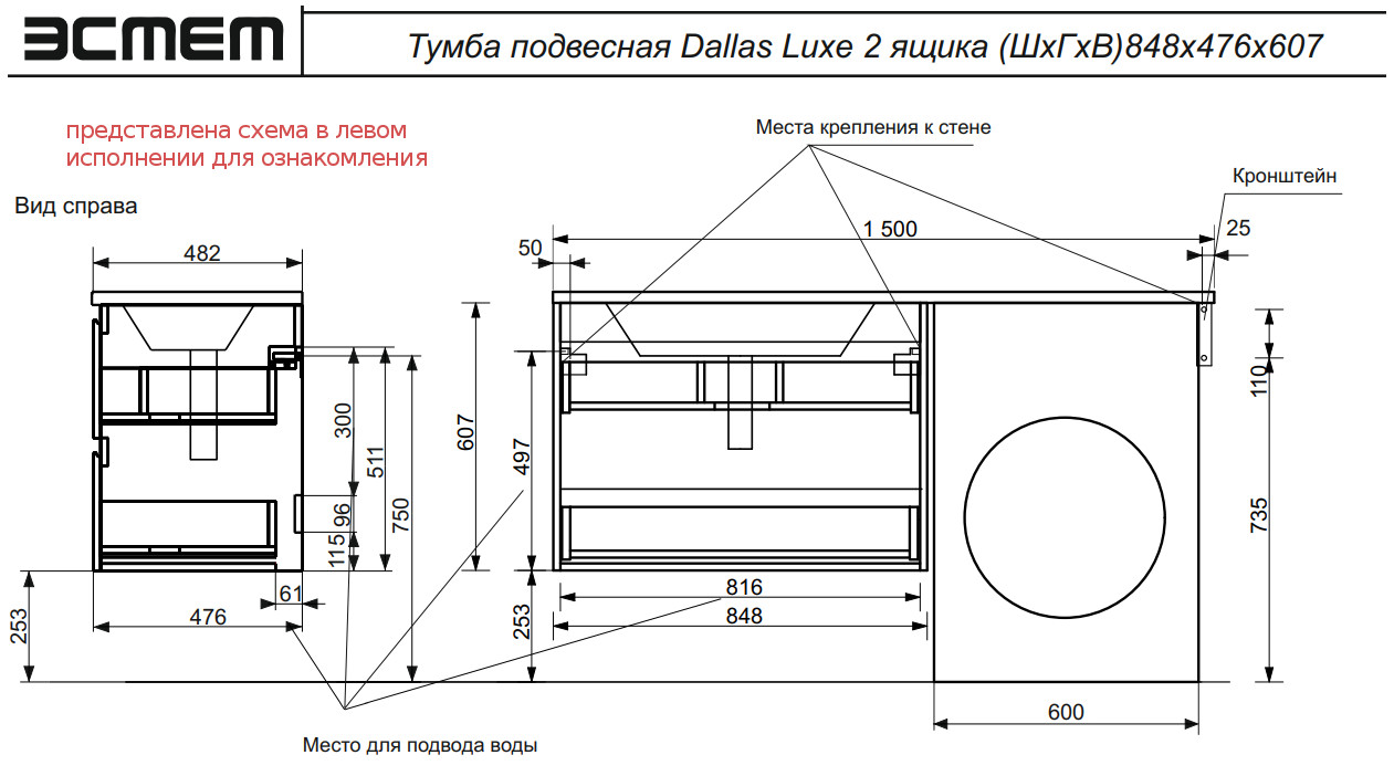 Тумба с раковиной Dallas Luxe 1500 навесная 2 ящика правая