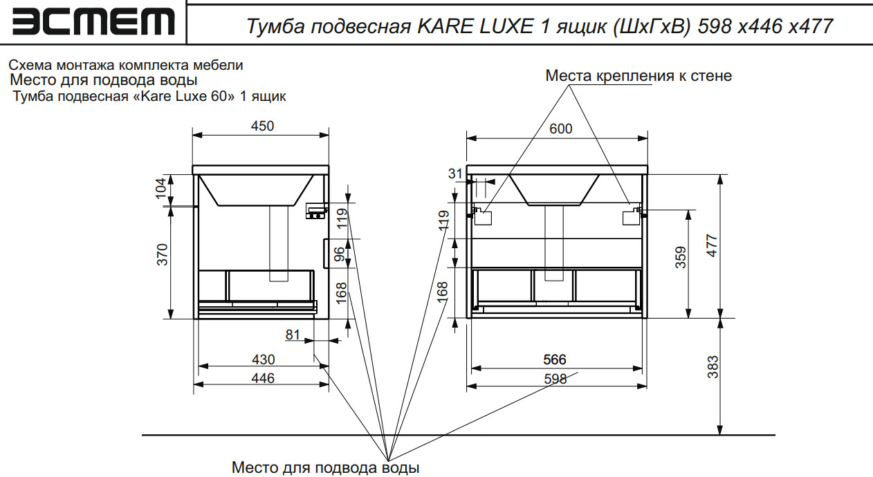 - Тумба с раковиной Kare Luxe 600 навесная 1 ящик