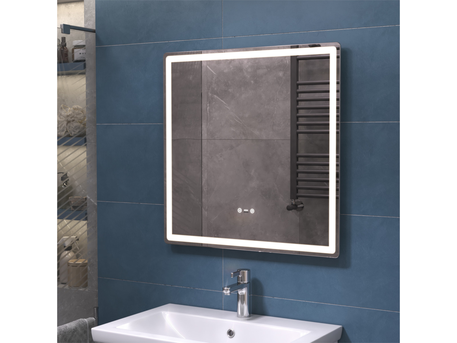 Подсветка фронтальная по периметру, с цветовой температурой 5000К – нейтральный белый, управление подсветкой сенсорное/датчик присутствия (1.5 м.)