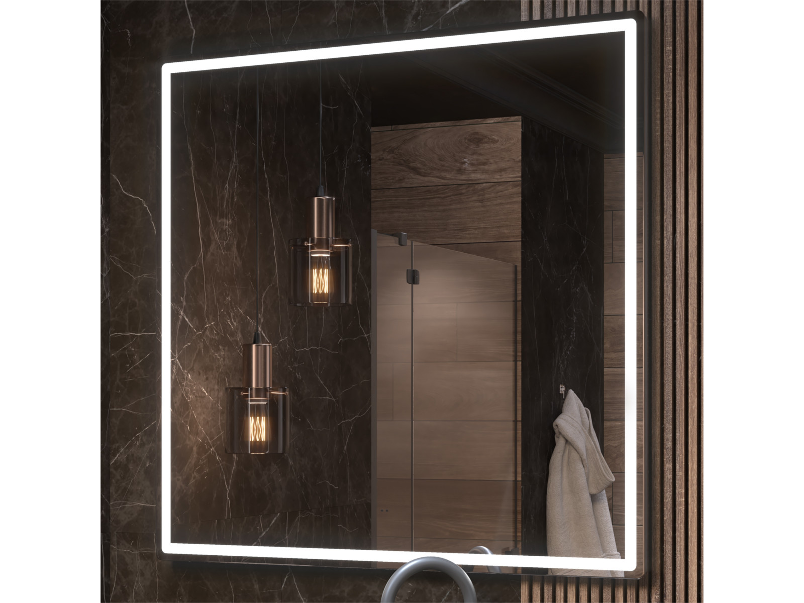 светодиодная подсветка по периметру; сенсорное управление; антизапотевание; включение на взмах