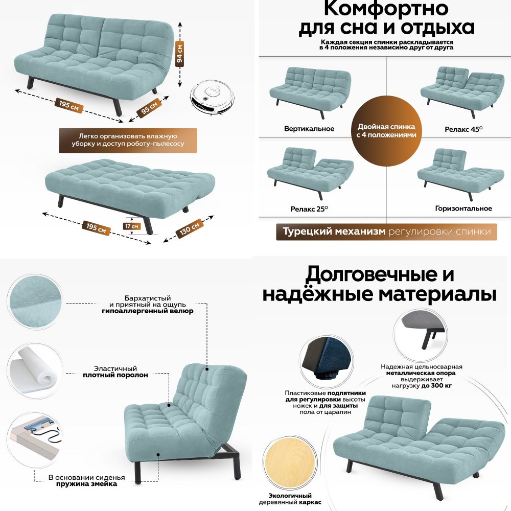 Встроенный механизм «клик кляк» позволяет трансформировать диван в 3 положения: