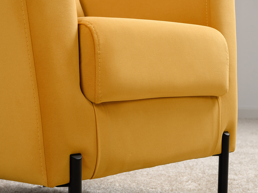 Декоративная утяжка на спинке кресла, декоративная подушка в цвете кресла, металлические опоры переходят в декоративный элемент подлокотника