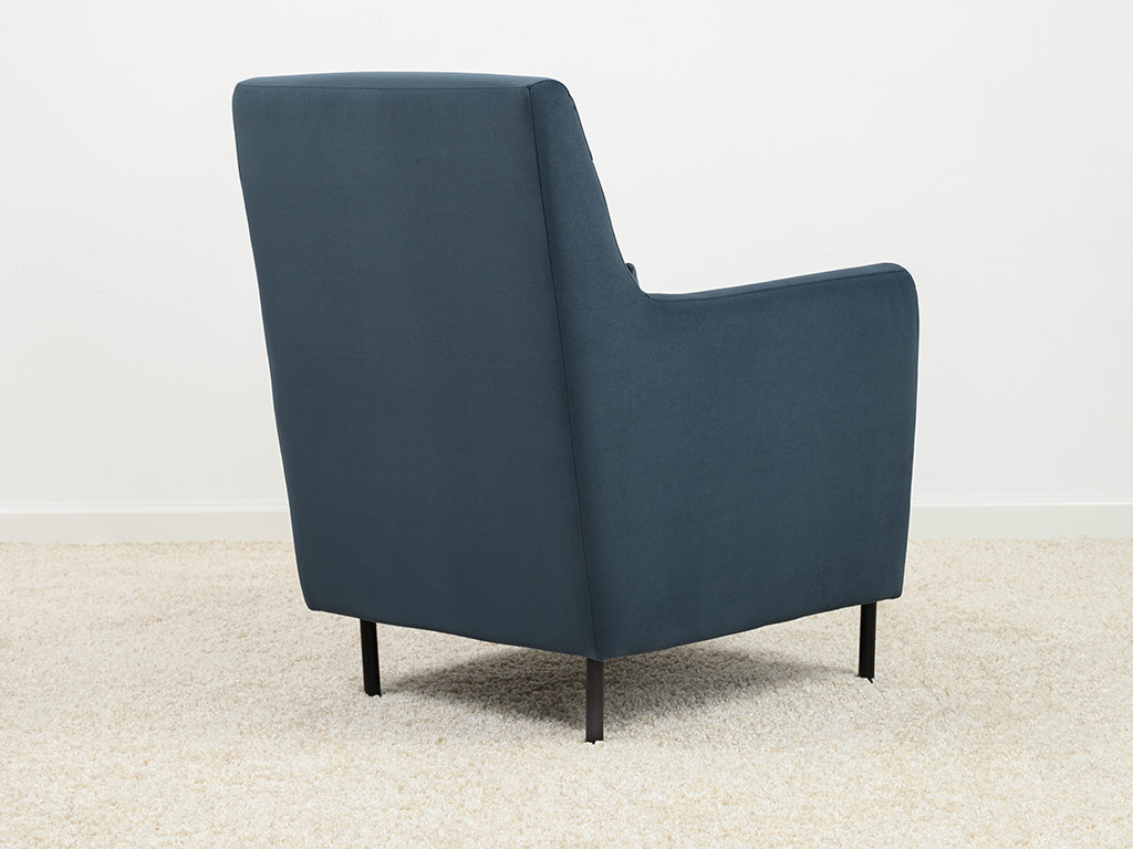Декоративная утяжка на спинке кресла, декоративная подушка в цвете кресла, металлические опоры переходят в декоративный элемент подлокотника