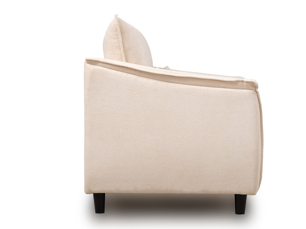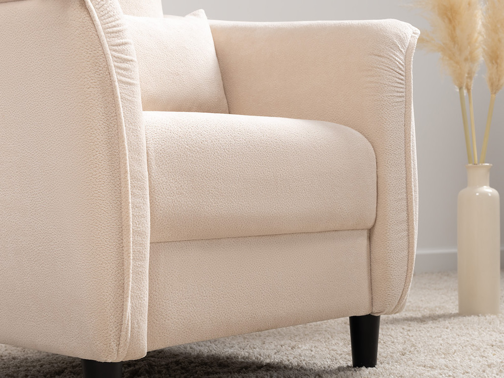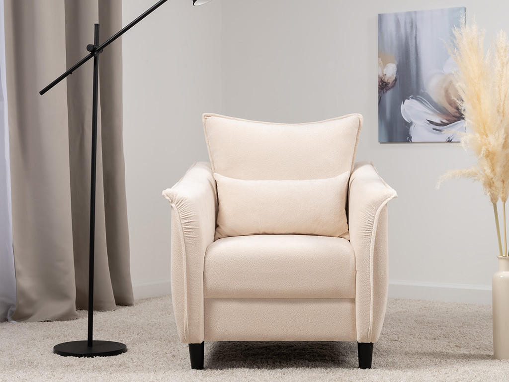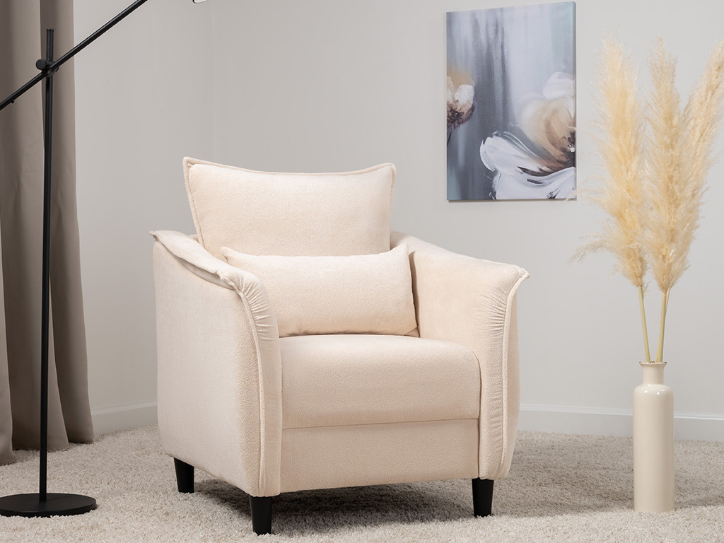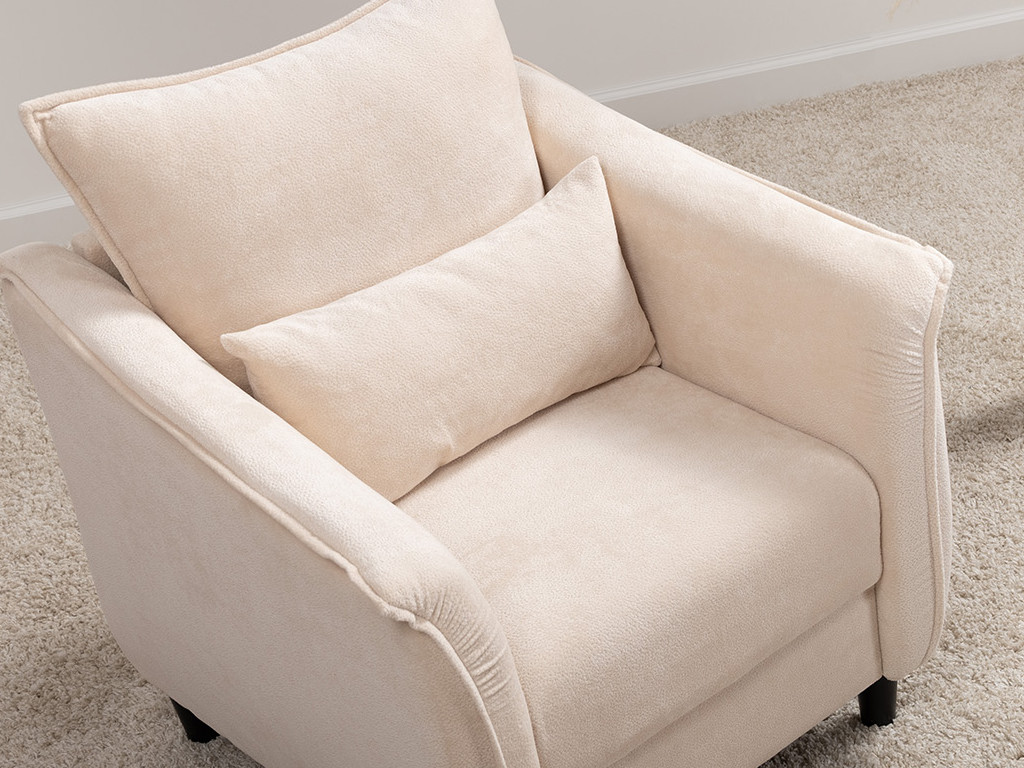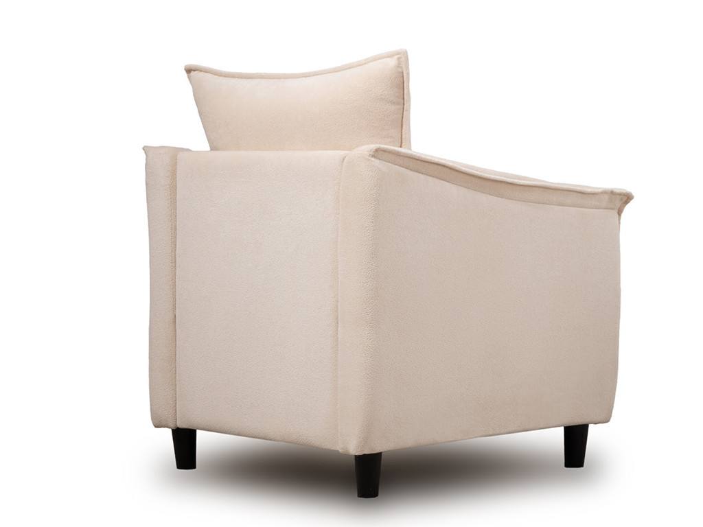 Кресло с приспинной подушкой трапецивидной формы на молнии, по трем сторонам которой проложена отделочная строчка на 1,2 см. По контуру боковин проложен декоративный кант на 1,2 см основной ткани. Кант проходит по центру передней части боковины, а по внутренней верхней части сборка.
