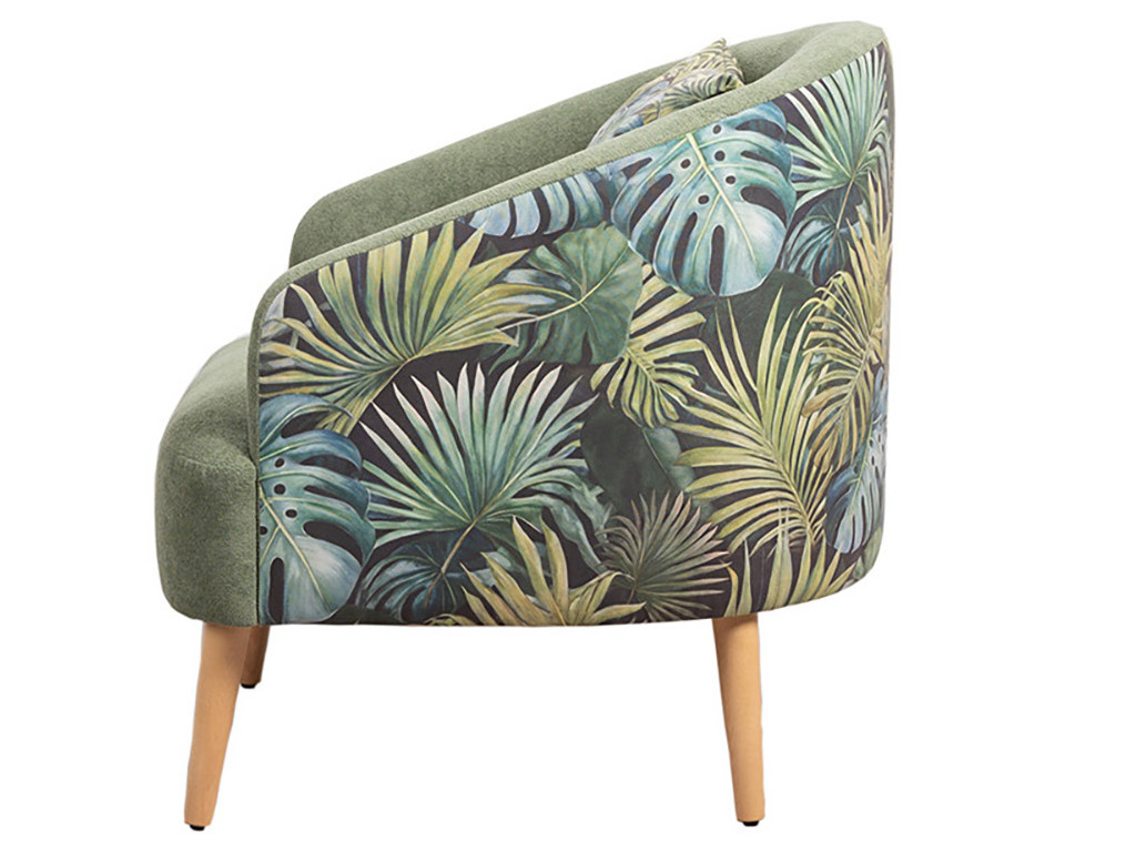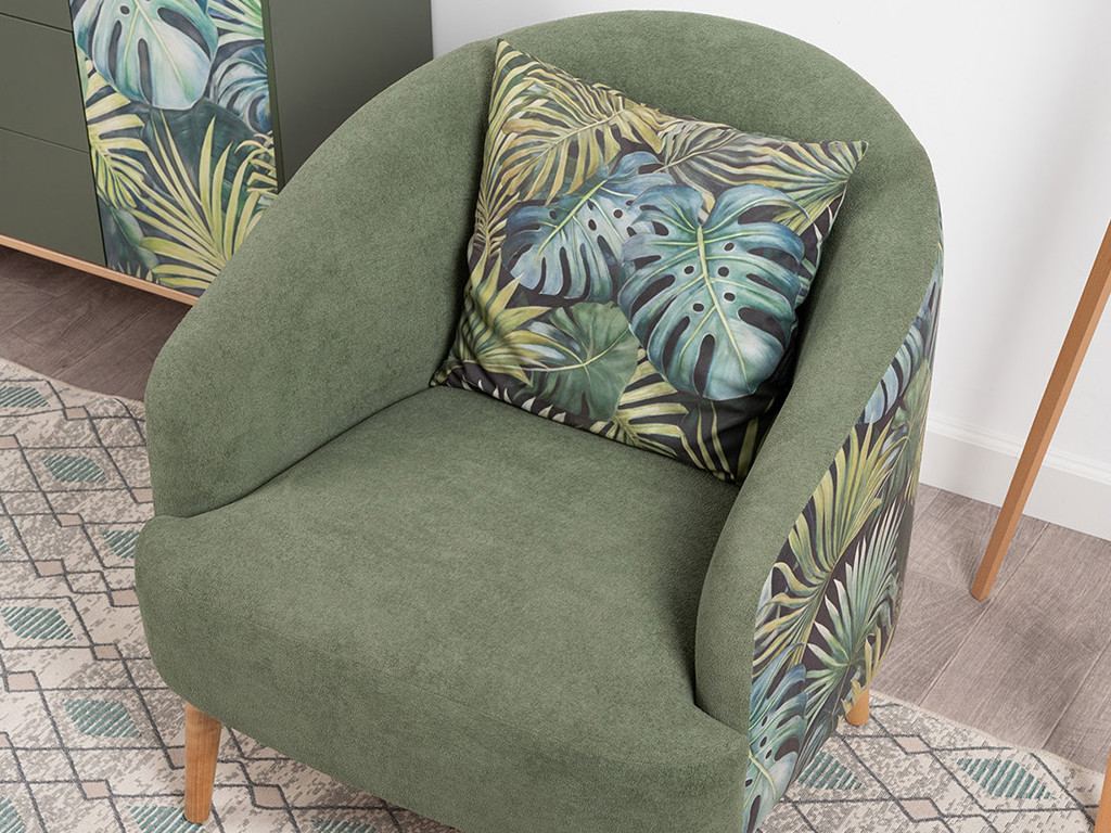 Кресло для отдыха на деревянных опорах. Спинка округлой формы переходящая в боковины. Кресло с подушкой думкой квадратной форы из ткани компаньон.