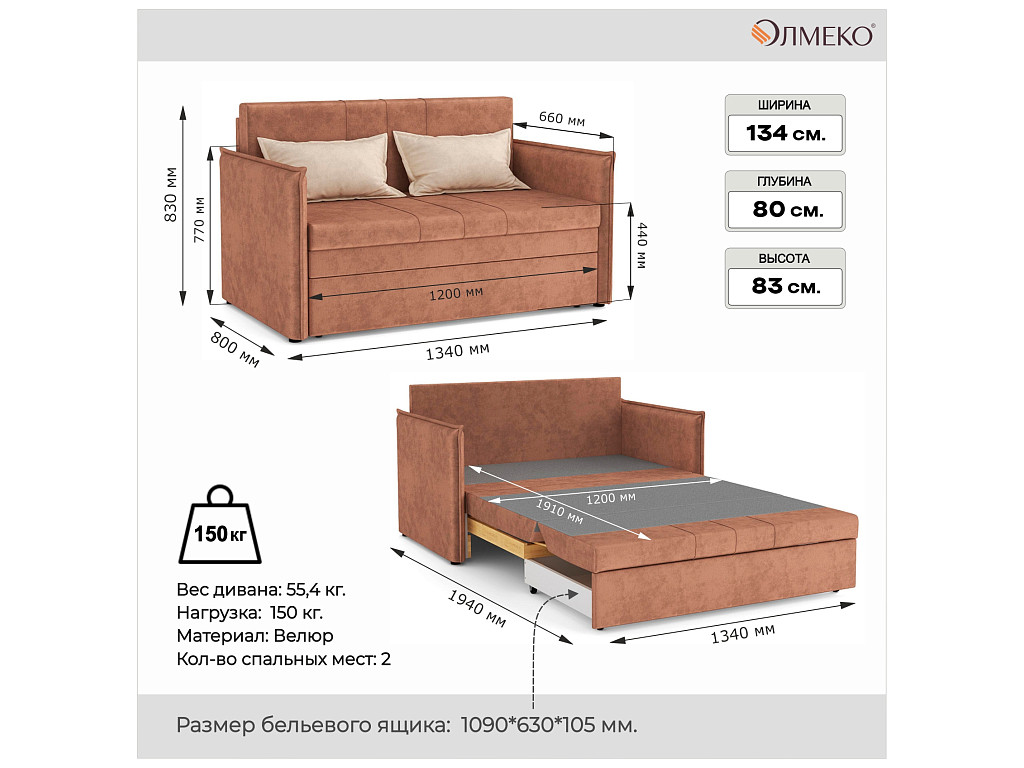 - Разложенный: 770х1340х1940 мм