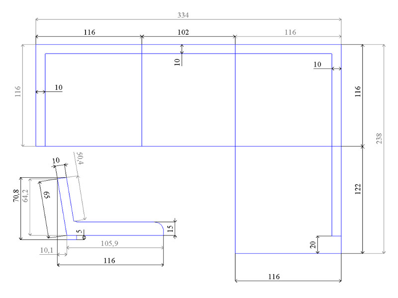 габариты по глубине подлокотника 116, ширина по фронту 334 ,  длина по угловой секции-238,  локотник 10 см