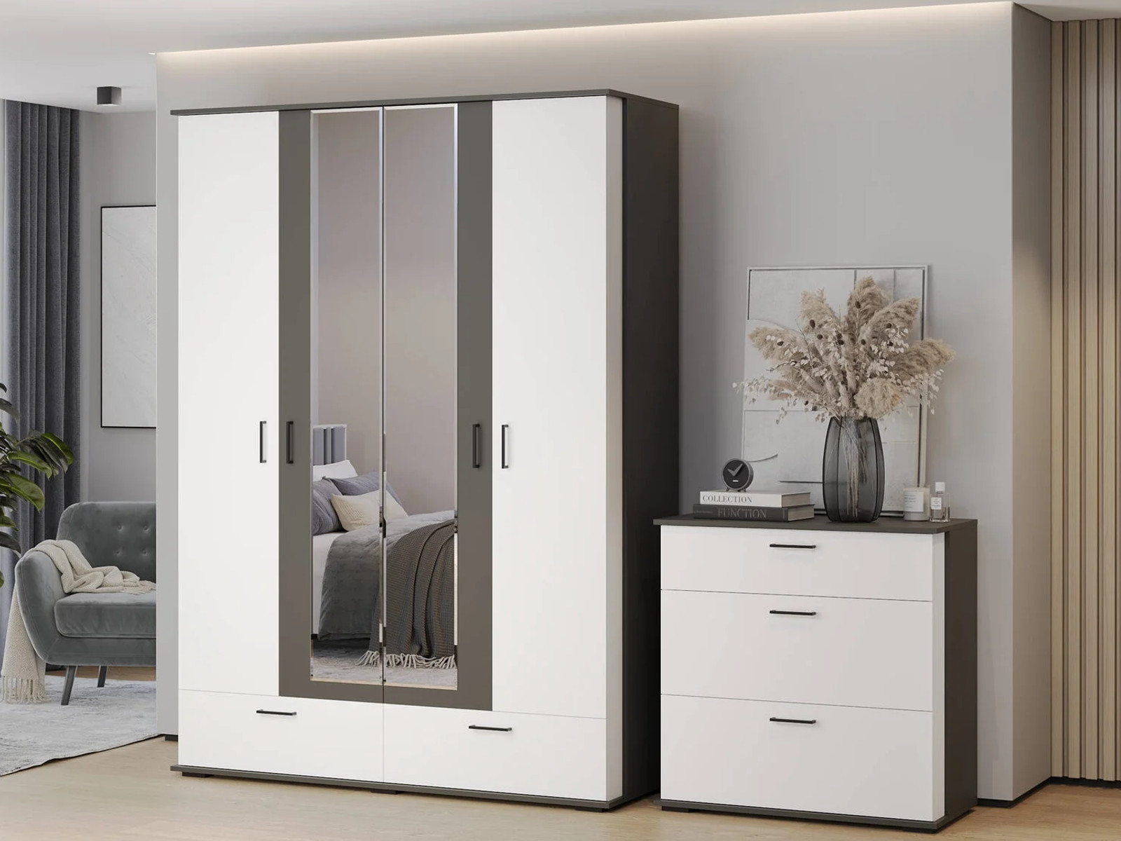 - Шкаф 4-х дверный с ящиками Даллас 4-4818 Графит, Белый