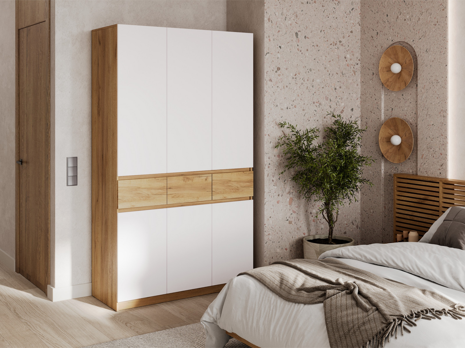 - Фасады без ручек — открываются за фасад (зазоры 30 мм скрыты декоративными планками).