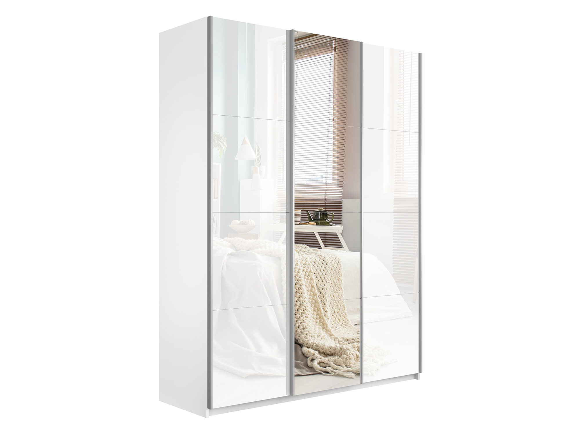- Шкаф-купе Прайм 3-х дверный 1800 два Стекла Белые/Зеркало Белый Снег