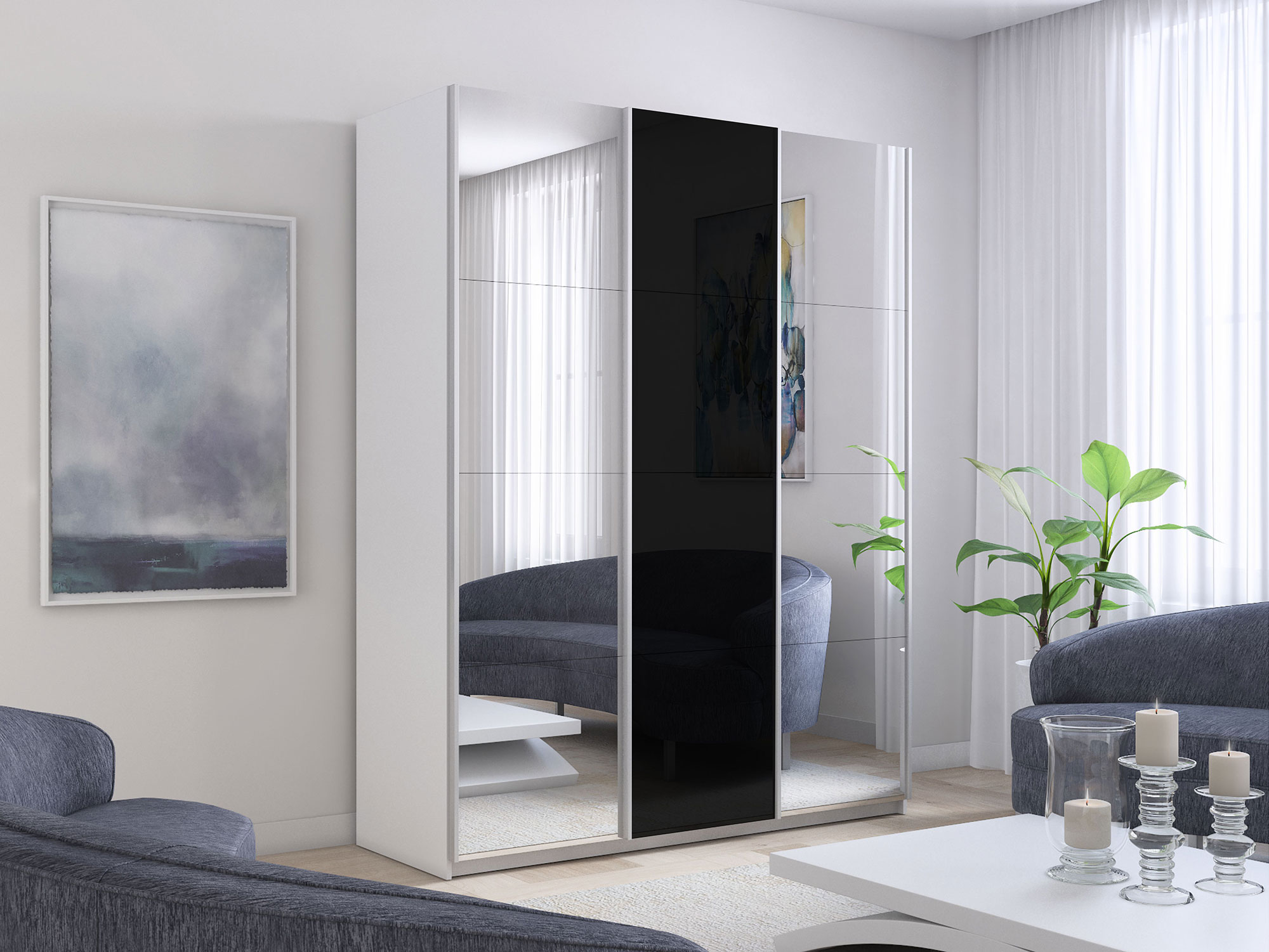Шкаф-купе Прайм 3-х дверный 2100 Зеркало/Стекло Черное/Зеркало Белый Снег