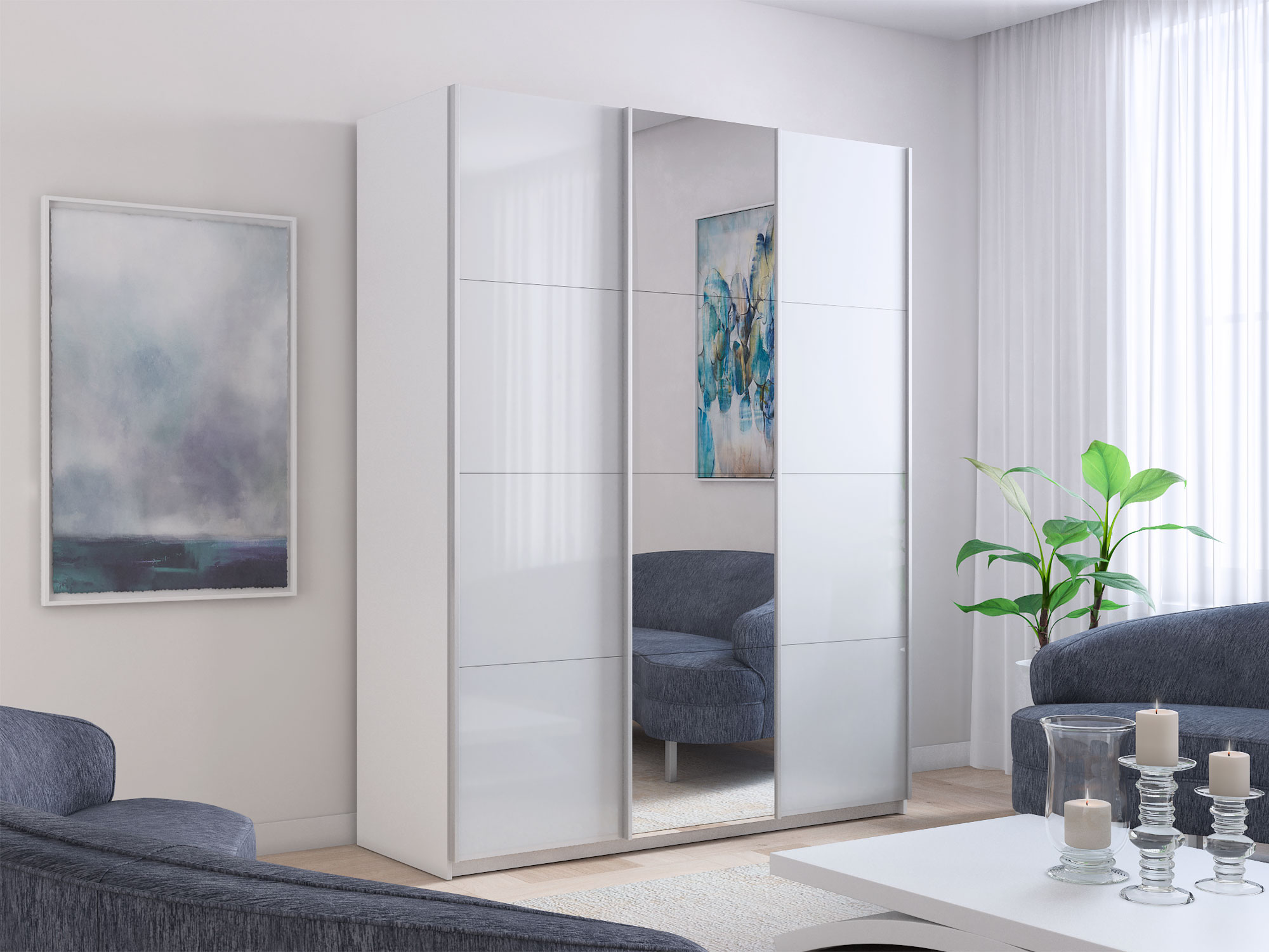 - Шкаф-купе Прайм Широкий 3-х дверный два белых стекла/зеркало Белый Снег