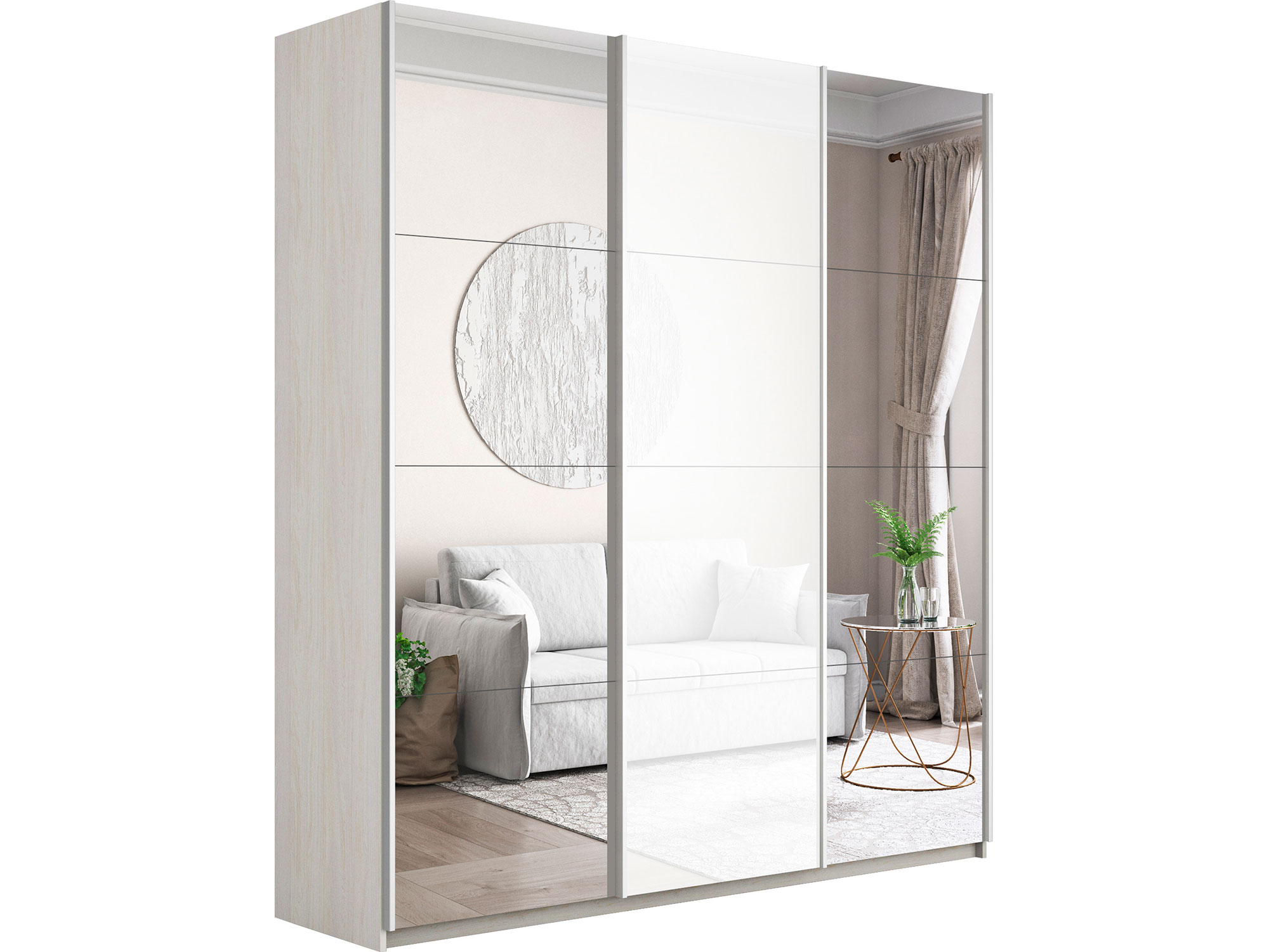 - Шкаф-купе Прайм Широкий 3-х дверный два зеркала/стекло белое Ясень Анкор Светлый