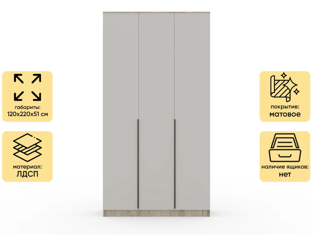 Шкаф Монблан New распашной 1200 3-х дверный Дуб крафт серый-Кашемир